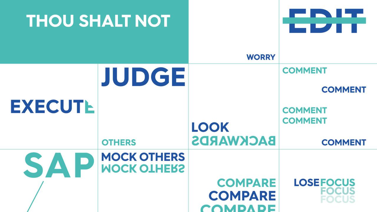 There are many different techniques to choose from, but we use one called ‘rapid ideation’. Set aside an hour or two, preferably in the morning. Gather your group of 5-7 people. To start with, each person writes down as many ideas as possible in ten minutes. The key here is quantity, not quality. After this, each person takes it in turn to share every idea they've had with the group, while one person writes the ideas onto a collaborative board. This is the time to share everything – the good, the bad, the ugly. And that requires courage. In fact, in our meeting room, we have the 10 commandments of brainstorming printed big on the wall (see diagram below - inspired by Josh Linkner). Once all ideas have been shared, everyone then takes another ten minutes to write down as many ideas as possible. This second phase is key, as it allows everyone to build on each other's initial ideas. Finally, the group shares all of their ideas while one person scribes. Then leave the room immediately (before you get the urge to review the ideas).