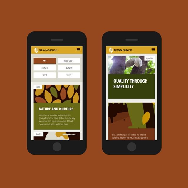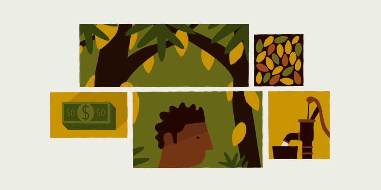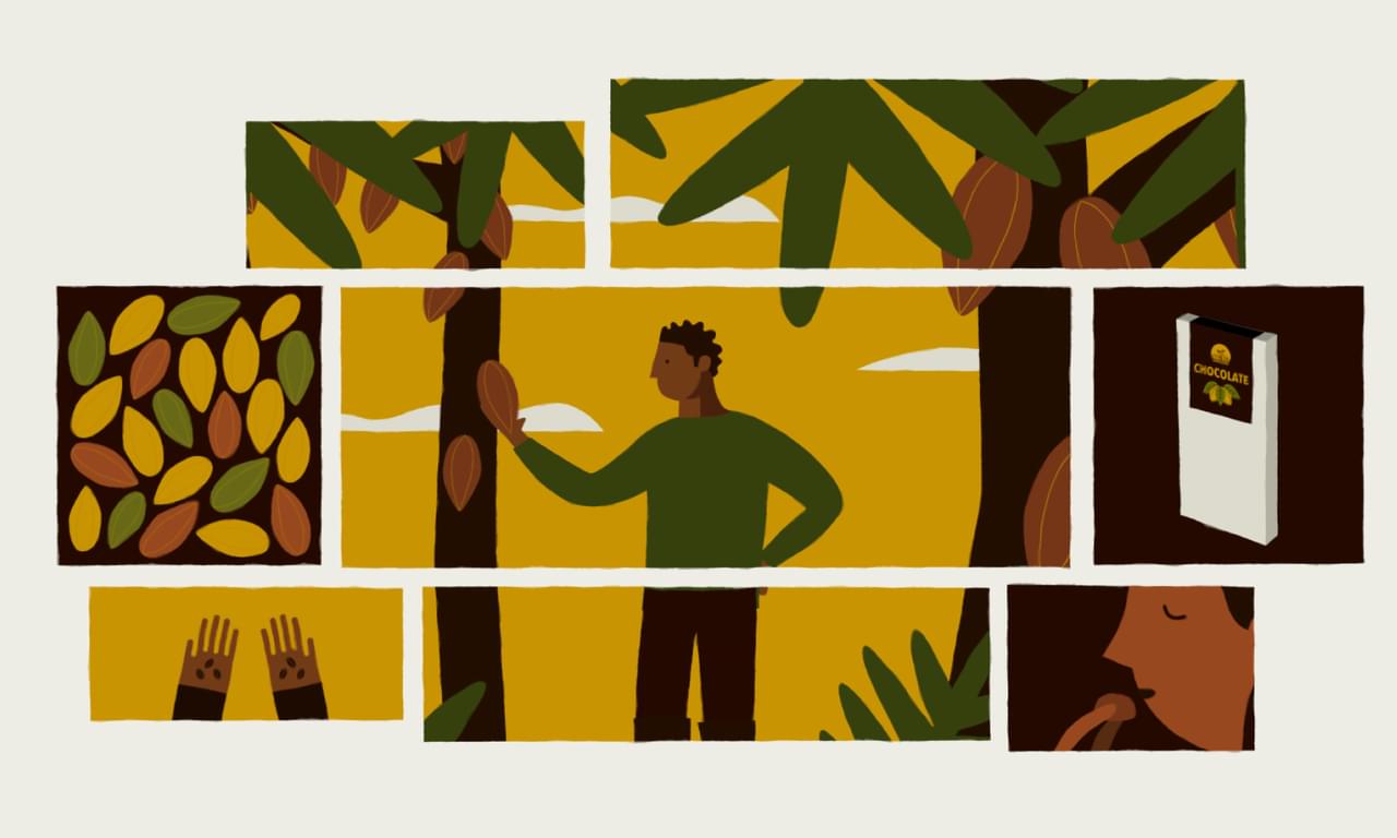 We wanted the audience to understand the tangible impact that working with the Cocoa Horizons Foundation can have. So we decided to tell the story of a cocoa farmer called Luke. The animation starts in the future, painting a picture of what a prosperous cocoa growing community looks like. But then the narrative comes back to the present day to show the hardships that cocoa farmers like Luke face. The story finally moves on to show how the Cocoa Horizons Foundation is working with farmers to improve their livelihoods. Inspired by Ivorian art, we developed a unique style of animation, showing the bigger picture through a series of animated, interlocking frames.