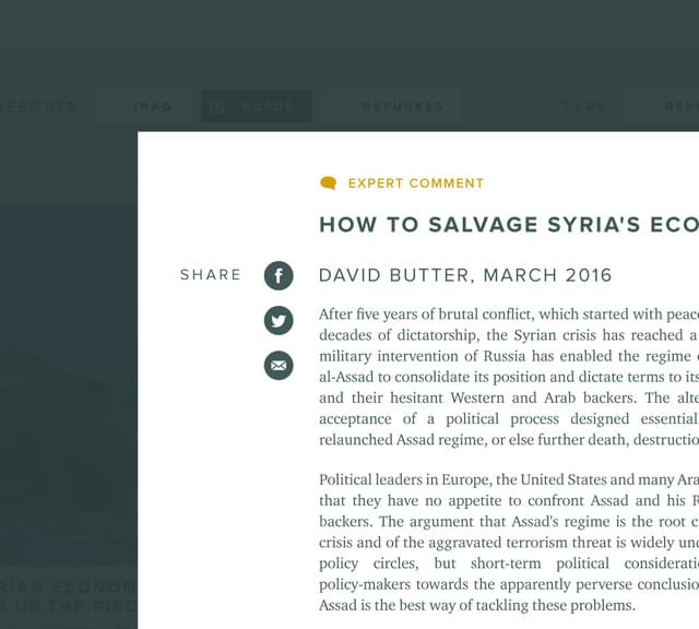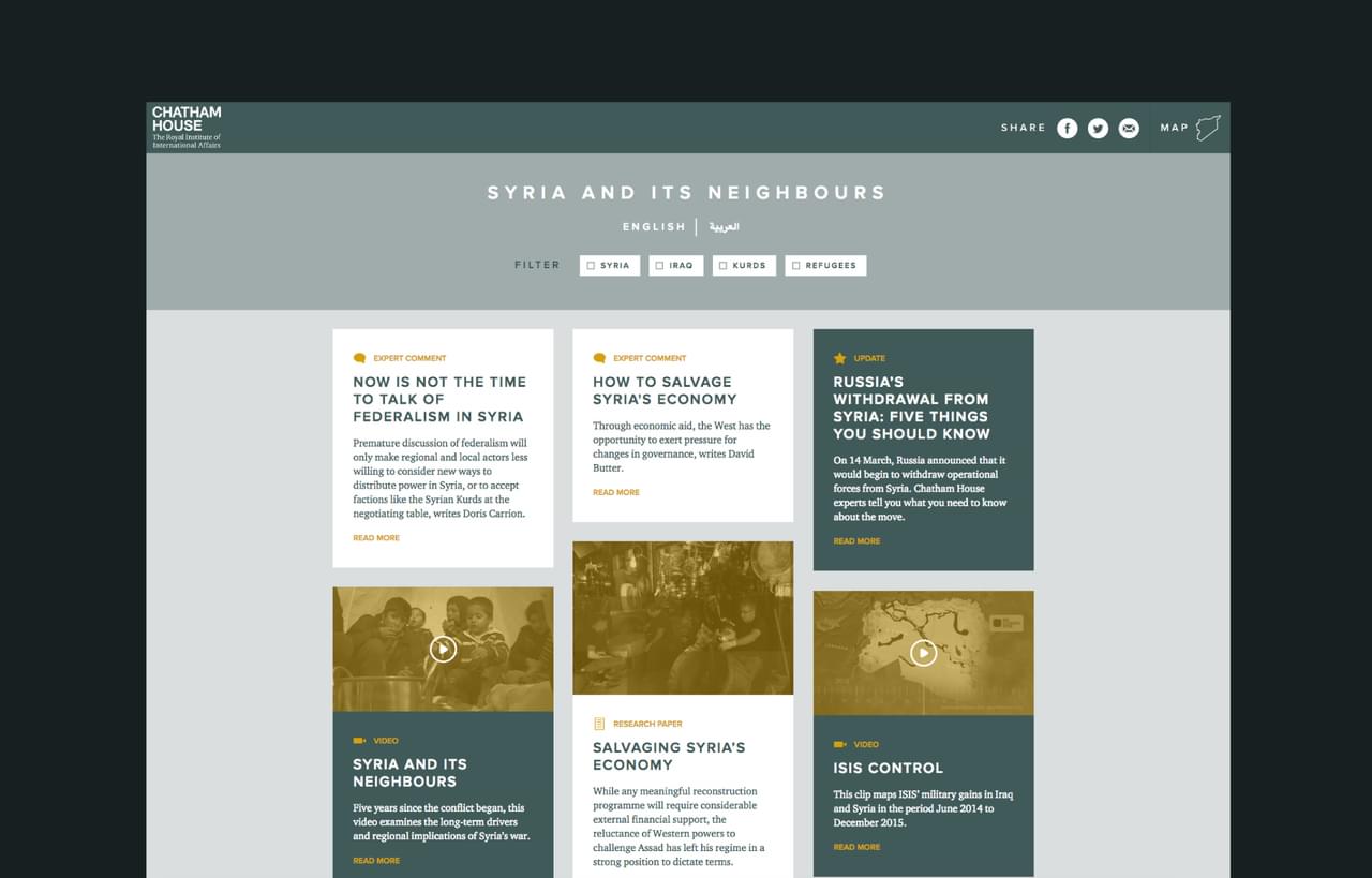 The conflict in Syria is still raging. But what have the impacts of the civil war been in Syria and its neighbours, Iraq, Lebanon, Turkey, Israel and Jordan? Chatham House came to us to develop a repository for key research which would do justice to the serious tone of the work.