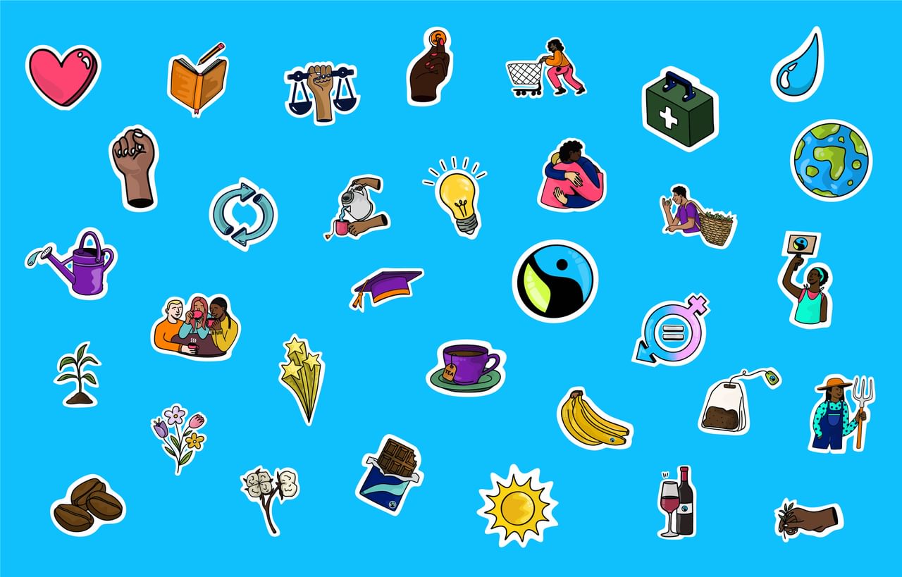 We worked in collaboration with illustrator, Tea (@teadayblogs), to create a suite of stickers which could work across the entire campaign. This meant finding simple ways to symbolise a number of problems and solutions within the trade industry. These contemporary stickers used the bright tones of the Fairtrade colour palette, bringing a distinctive and illustrative style to the campaign.