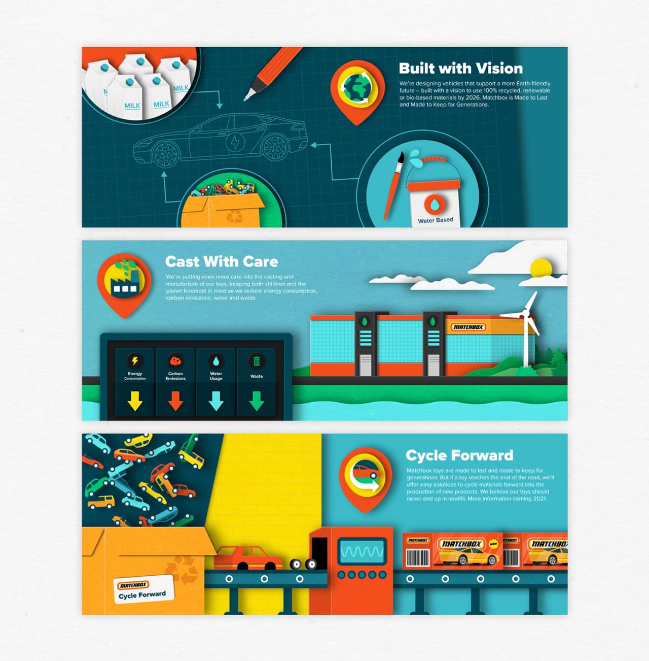 For nearly 70 years, Matchbox has believed in the importance of play as a vehicle to help kids explore the real world around them and shape an appreciation for it. We helped them bring their sustainability commitment 'Driving Toward a Better Future' to life through a new visual identity and animated story.