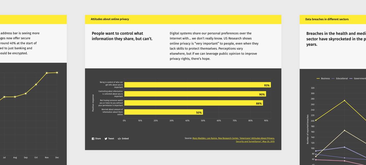 As the Internet Health Report tackles global issues of Internet usage and policy, our task was how to present large data sets in an eye-catching and unbiased way, highlighting the disparity between how “healthy” or “unhealthy” a particular issue was in different parts of the world. Mozilla pride themselves on being open-source and accessible, so our site enables annotations, comments and social sharing throughout, ensuring that the the site stays current and evolves with time. The Internet Health Report has fully customisable elements, allowing the whole site to be translated into multiple languages - available and accessible to curious Mozillians worldwide. We worked closely with branding agency Johnson Banks, evolving the style of the site iteratively as key visual elements of the new brand were determined.