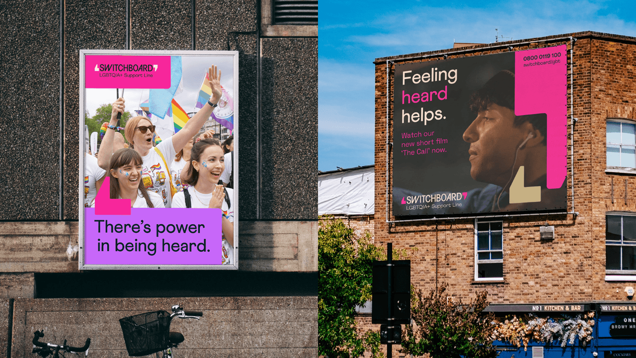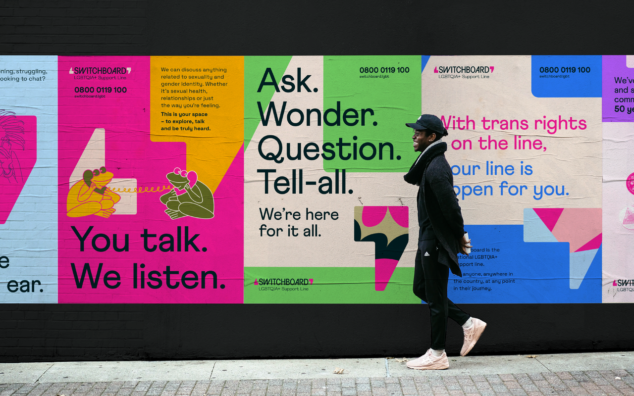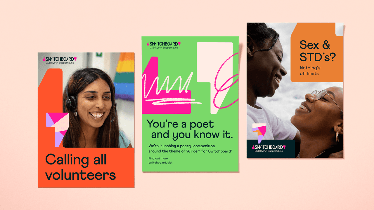 Built around the idea of creating 'space for every conversation', we positioned Switchboard as a welcoming space for anyone in the extended LGBTQIA+ community to talk about whatever is on their mind. Influenced by this, we updated their strapline to ‘LGBTQIA+ support line’ to help more clearly communicate their offer. All with the aim of helping them to achieve their vision of a society where no one in the LGBTQIA+ community feels alone.