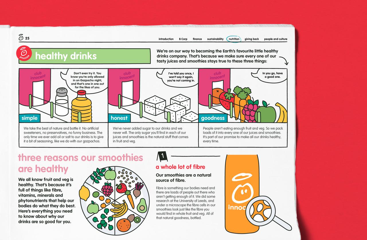 This creative report format meant we could keep innocent’s bold type front and centre, whilst chopping and changing between photographs and innocent doodles for each feature. We struck a good balance between black and white newspaper cues and innocent’s bright brand colours to make it an enjoyable read for everyone.